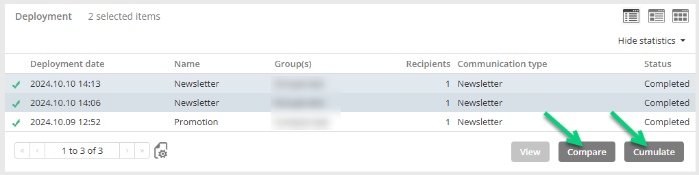 In the list, click the messages you wish to cumulate or compare. Then, click Compare or Cumulate depending on the case.