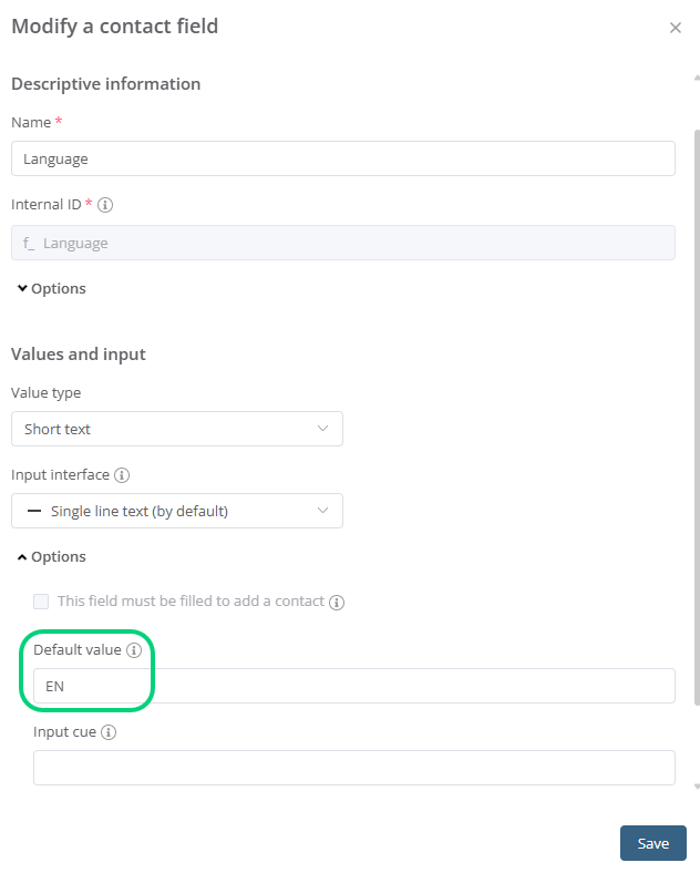 You could also add a default value for empty fields. This way, you don't have to manually fill out that value for every contact. For example, you could put the default value "English" for the Language field: