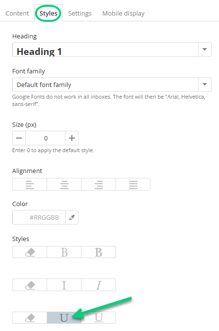 When you insert a link in a Text or Title block in an email, that link is automatically underlined. Here are some methods to remove the underlining and to manage the link styles.