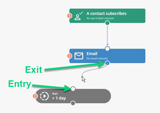 The elements have only one entry point, and most have only one exit point. An exit point determines the continuation of the campaign. If you add new elements, you must link them using a connector that starts from an exit point leading to an entry point. To use a connector, click an exit point and maintain the click, then drag the connector to an exit point and release the click: