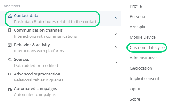 In an automated campaign, you can add a condition that targets contacts included in a phase of the customer life cycle: