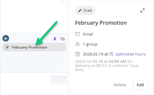 If you hover you mouse on a campaign, you will have details, such as the groups and the number of contacts who are targeted:
