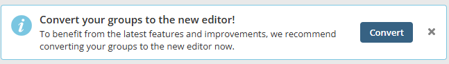 If you have groups that have been created with the old editor, you can convert them by going in the group you want to convert. You will then see this message in the upper part of the editor: