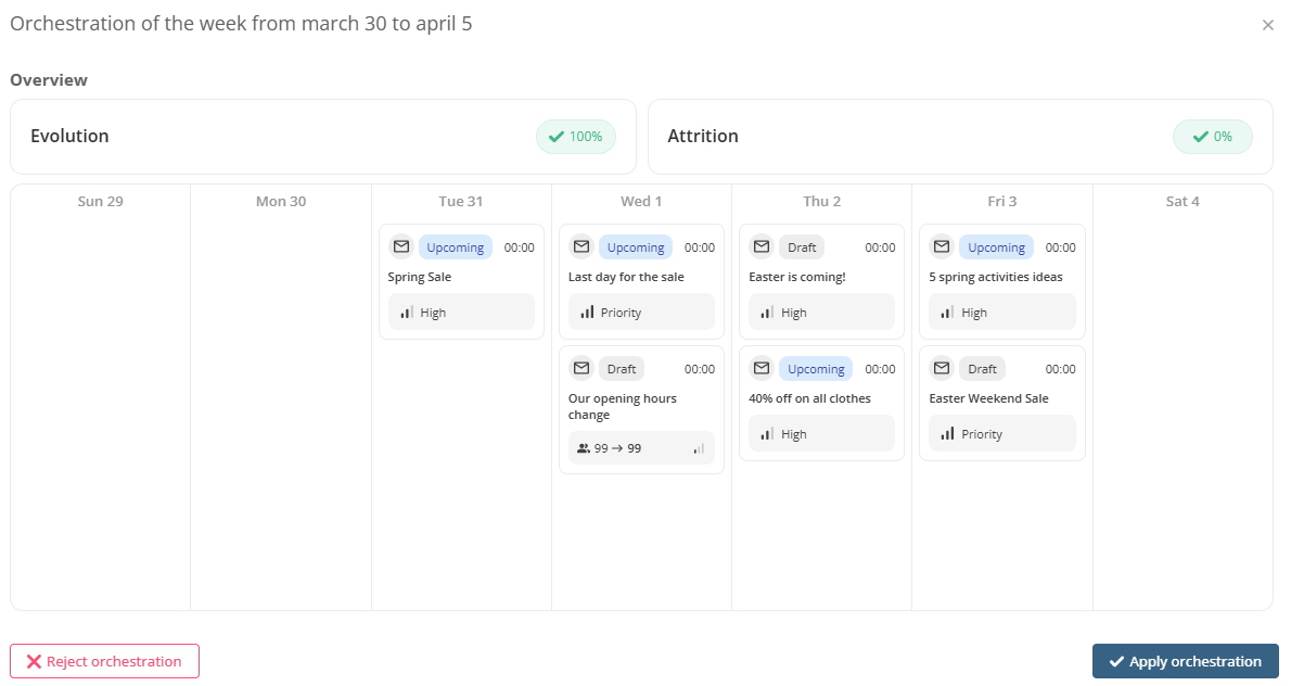 Planned campaigns appear in the campaign calendar. Campaign with the Draft status will be included in the orchestration. You can therefore create campaigns without final content in advance. However, be sure to complete and approve each campaign before its send date. Once you have added all the campaigns for the week, you can proceed to the next step.