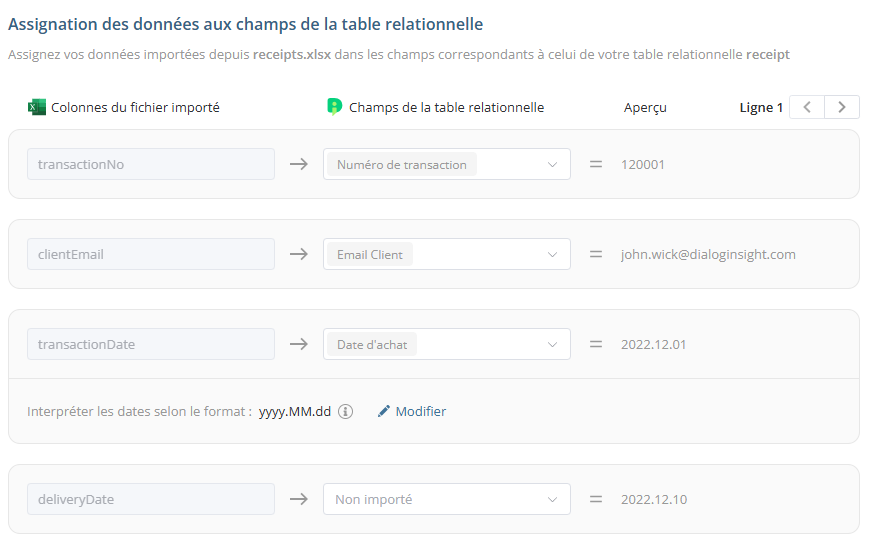 Assignez les champs du fichier importé aux champs à leur destination dans la table relationnelle du projet :