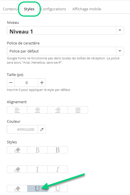 Lorsque vous insérez un lien dans un bloc Texte ou Titre dans un courriel, ce lien est automatiquement soulignés. Voici quelques méthodes pour enlever le soulignement des liens et pour gérer le style des liens.