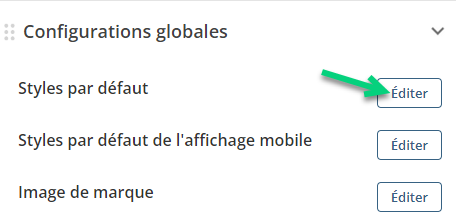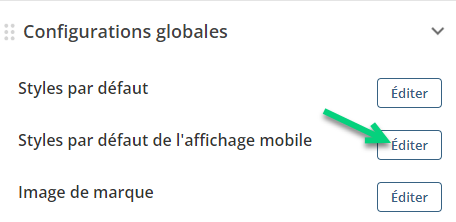 Dans l'interface Édition, vous avez des options dans le panneau de gauche. Dans la section Configurations globables, vous pouvez éditer les Styles par défaut de l'affichage mobile :