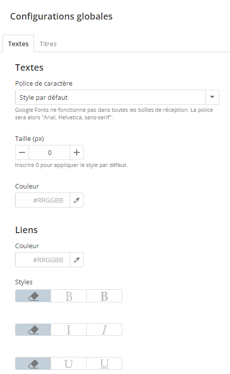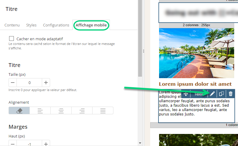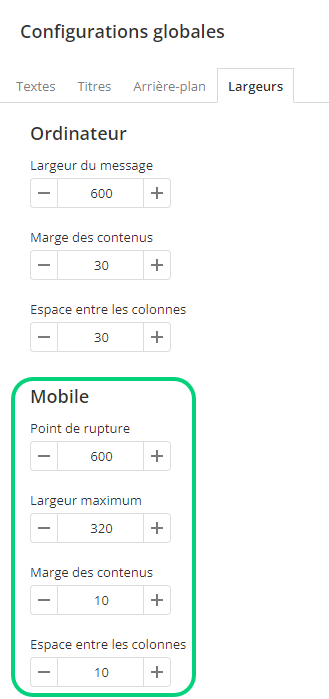 Ces configurations s'appliquent globablement aux éléments de la version mobile de ce message. Vous pouvez quand même modifier un élément de façon individuelle en éditant son style dans le bloc dans lequel il se trouve (ex. : bloc de texte).