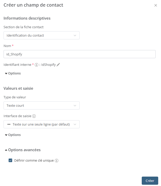 Chaque projet doit avoir une clé unique (une valeur unique qui permet d'identifier chaque contact et de s'assurer qu'il n'y a pas de doublons). Dans une structure CDP, vous devez utiliser un projet source dédié à votre boutique Shopify. Vous devez alors créer une clé unique qui correspondra aux identifiants Shopify (on importe les identifiants des contacts de votre boutique Shopify et les stocke dans la clé unique).