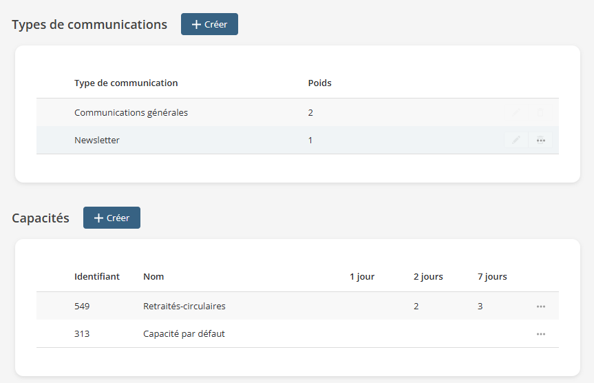 Les capacités servent à établir la limite d'envoi pour vos différents publics au cours d'une période. La capacité peut être définie sur différentes périodes (1, 2 ou 7 jours). Dès que, pour une des périodes, la capacité est atteinte, le contact ne recevra plus aucun des messages pour les types de communication configurés jusqu'à la fin de la période.