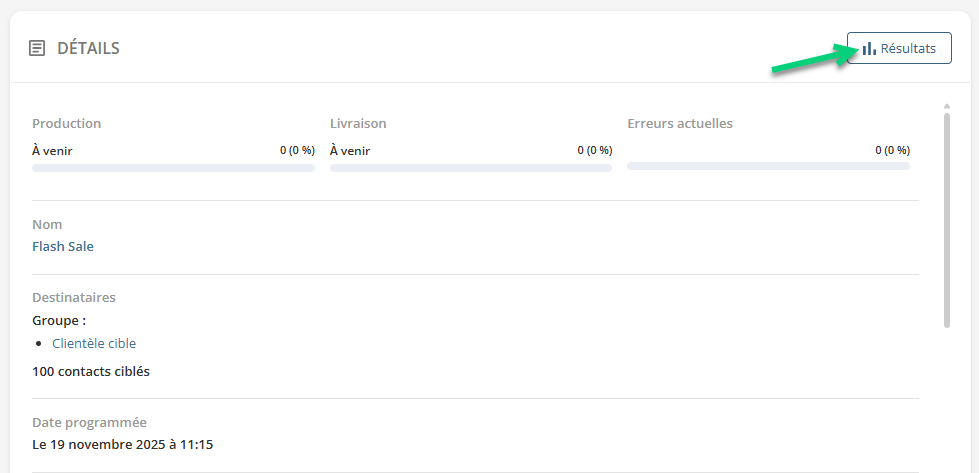 Lorsque vous approuvez un envoi, dans la page de détails, cliquez sur Résultats pour voir les contacts qui sont exclus de l'envoi, car ils ont atteint leur capacité :