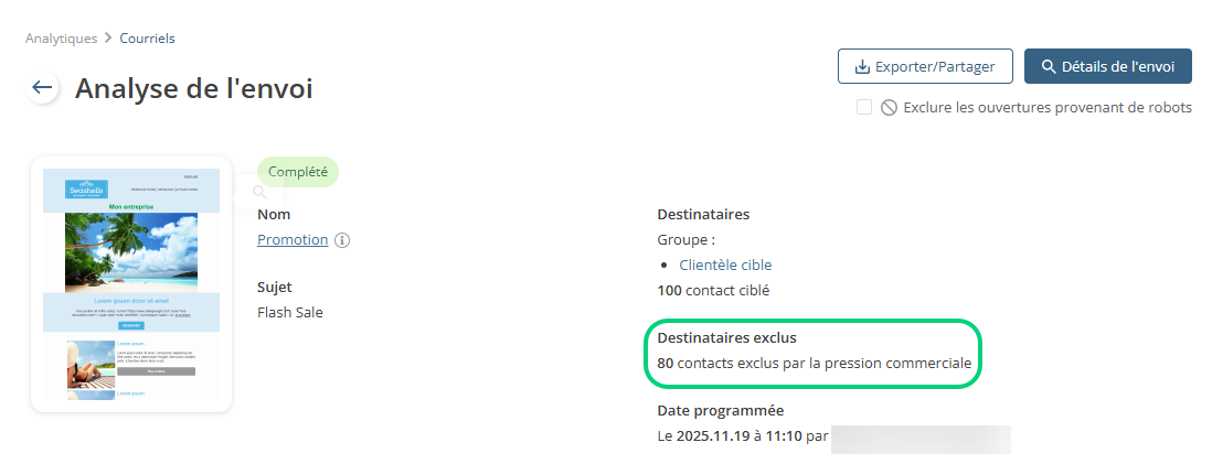 Ensuite, vous pourrez savoir le nombre de contacts exclus de l'envoi parce qu'ils ont atteint leur capacité :